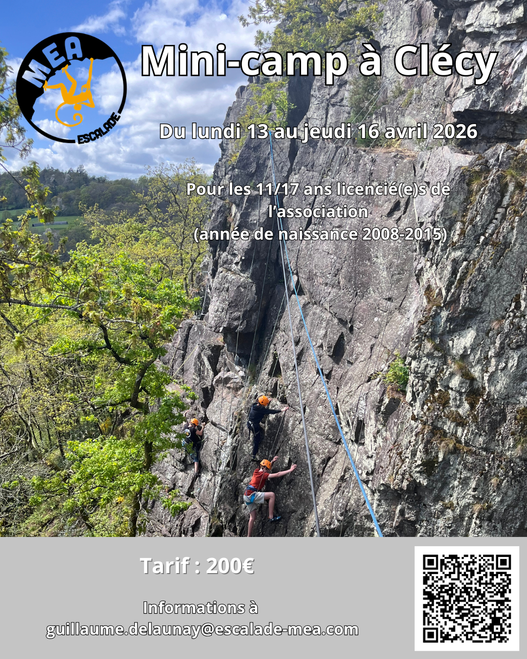 Pour tout renseignement, vous pouvez contacter l'association par mail à secretariat@escalade-mea.com